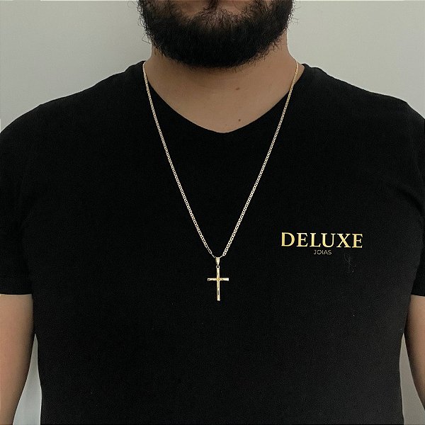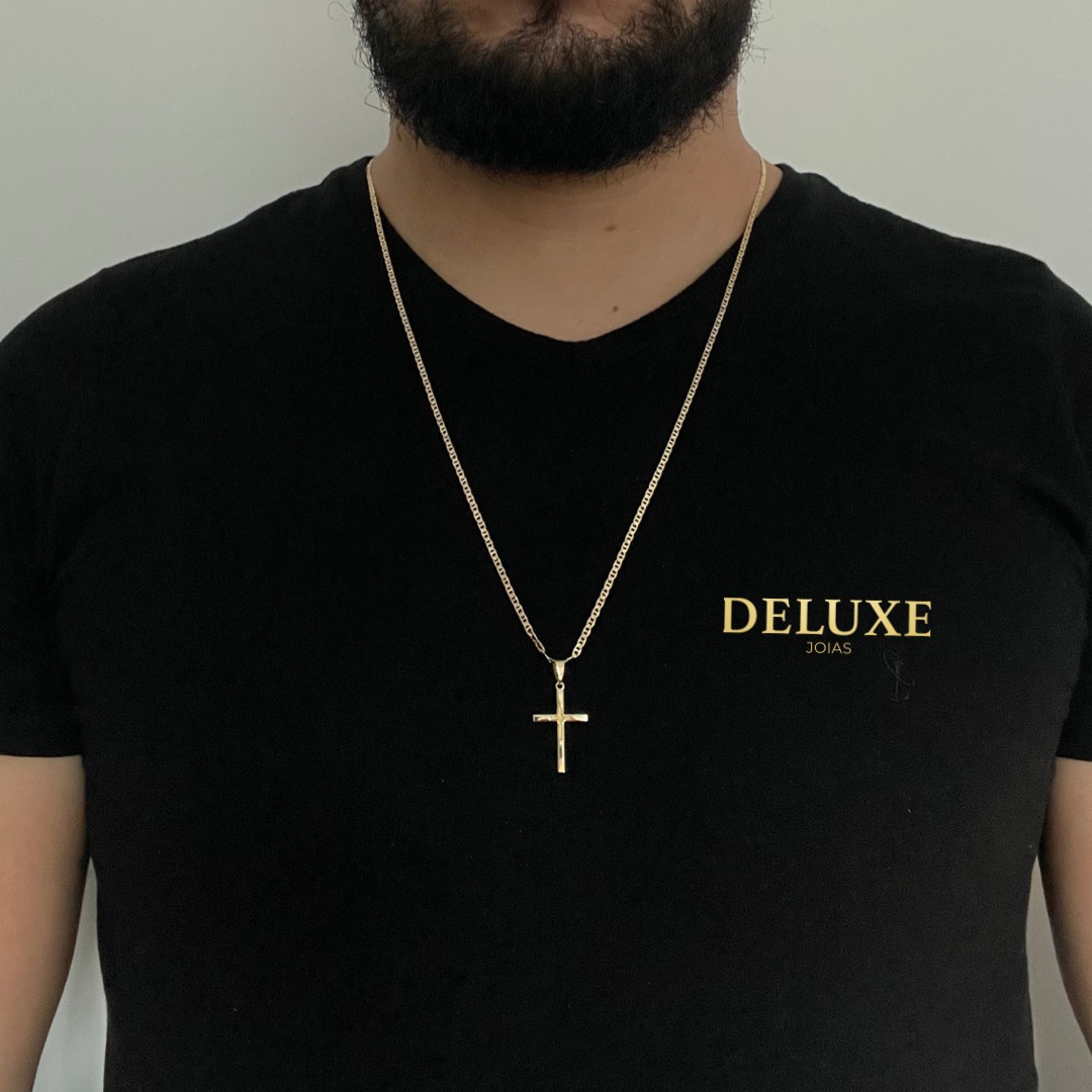 CORRENTE PIASTRINE( 2mm - 70cm) + PINGENTE CRUCIFIXO - BANHADO A OURO 18K.